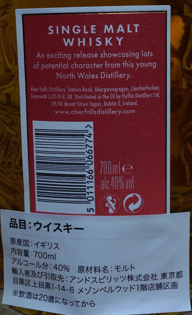 2026/2/8開封、価格は2,880円。度数40.0度、容量700ml。産地はウェールズ、アバフォールズ蒸留所です。アバフォールズは、北ウェールズで百年ぶりに設立されたウイスキー蒸溜所です。私の知る限り、ウェールズに存在するウイスキー蒸留所は、アバフォールズとペンダーリン蒸留所の二つだけです。