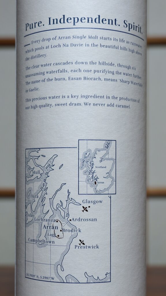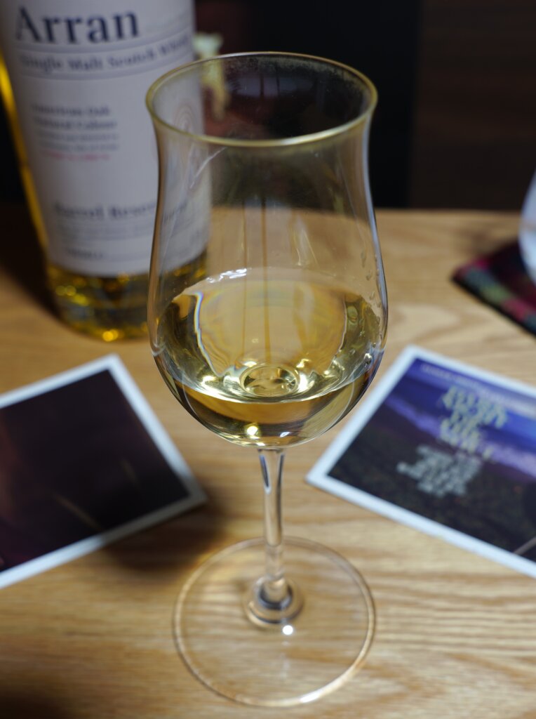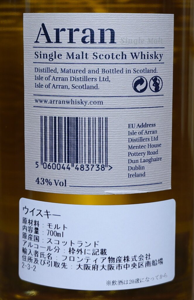 2025/10/1開封、価格は3,880円。度数43.0度、容量700ml。産地はスコットランドはアラン島、アラン蒸留所です。アイランズモルトに分類されます。ファーストフィルのバーボンバレルのみを使用して7~8年間熟成させた、アランの入門用商品です。ラベルに「Natural Colour」の表記がある通り、無着色です。
