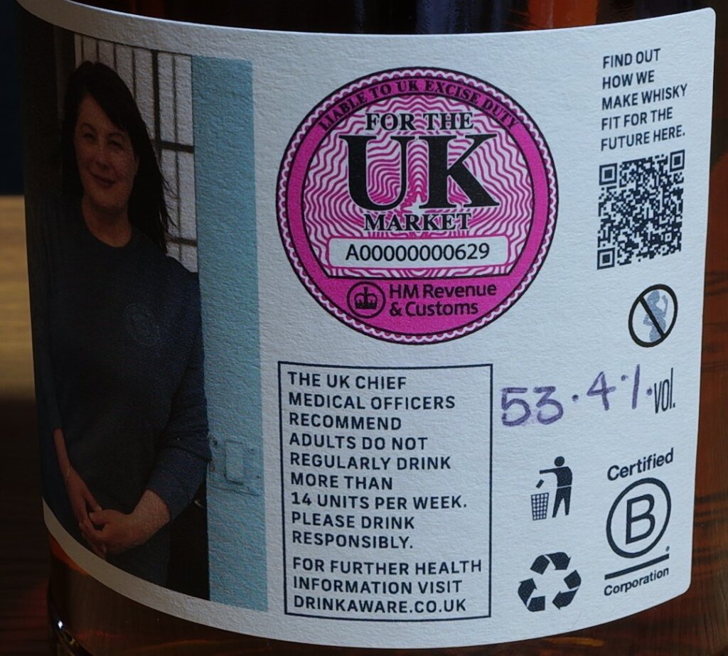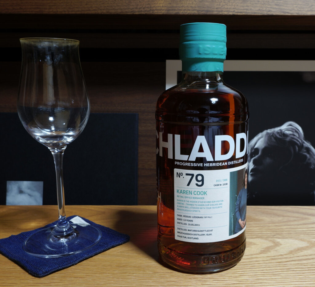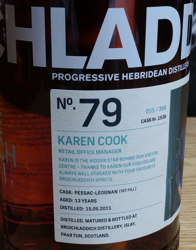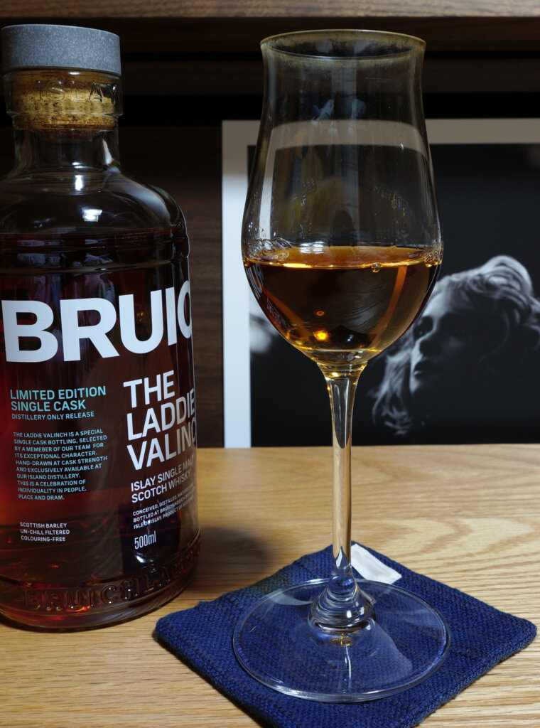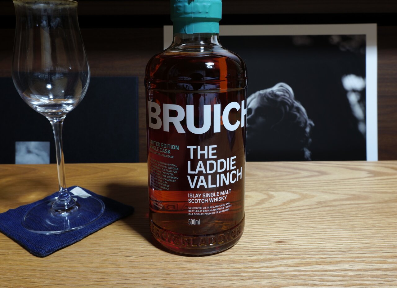 ラベルを見ると、手書きで53.4度と書いてあります。ヴァリンチと言えば、モートラックのヴァリンチをバーで飲んだ事があります。この商品と違い、ラベルは手作り感が強い物だったと記憶していますが、天に召されそうな程美味かったのを覚えています。ラベルにはブルイックラディのビジターセンターに務める、カレン・クックなる人物の写真が貼られています。そこにはカレンさんとやらが縁の下の力持ちである事や、労いの言葉が書かれています。こう言うのは良いですね。日本の会社では、社員に対する感謝など殆ど無いからです。ブルイックラディは瓶のデザインが秀逸。単純ですが、文字の配列や大きさ等、とてもセンスが光ります。