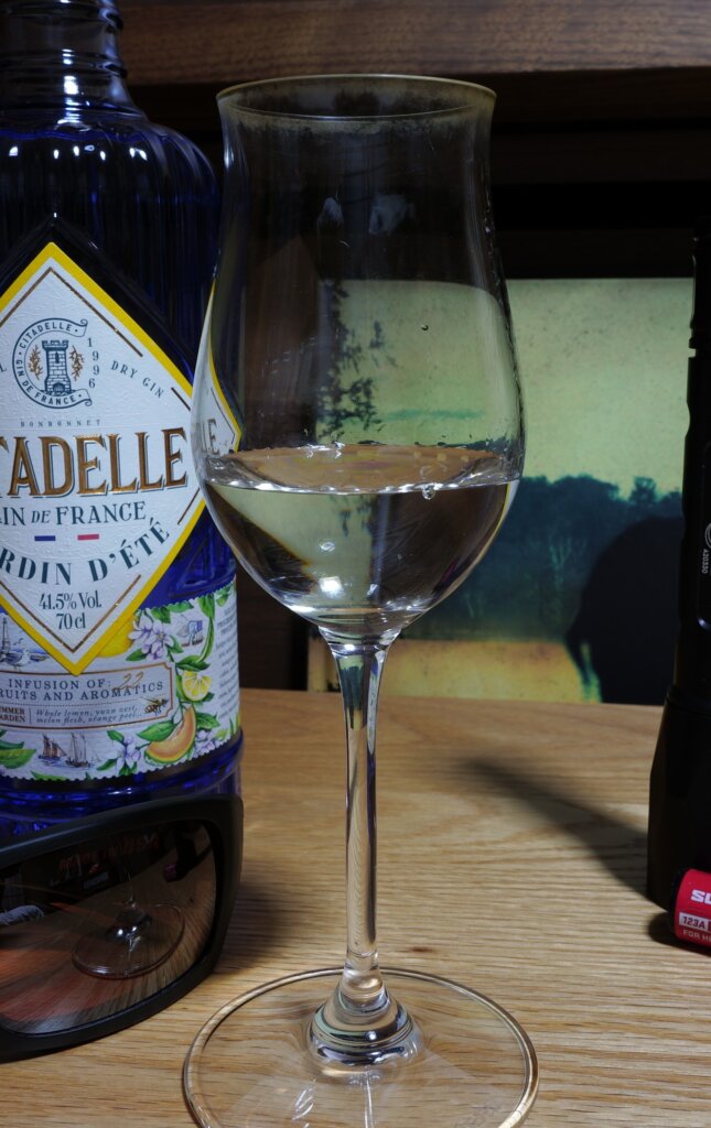 色は無色透明。瓶は重厚で威厳があり、正にシタデルの名に相応しいでしょう。瓶から直接匂いを嗅ぐと、穏やかで安らぎを覚える、上品な柑橘系の香りがします。変な表現かもしれないですが、入浴剤みたいに落ち着く香りでした。グラスからより、瓶から確認する方が香りが分かり易い。グラスからはジュニパー以外に、香辛料や桂皮系の香りが分かると思います。すっとしています。