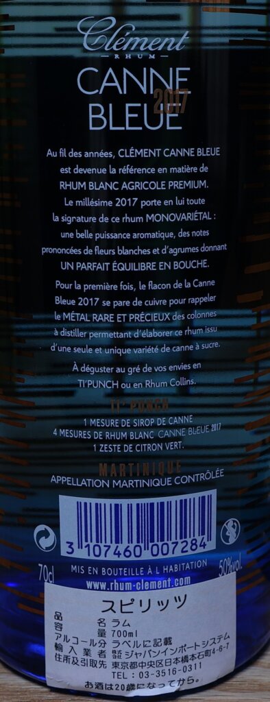 クレマンは去年バーで知った銘柄で、青く綺麗な瓶が目を引いて購入しました。瓶の正面に、マルティニークのアグリコールラムである事が表記されています。カンヌブルーは限定品ですが、度々この名を冠する商品を出しているようです。ネットを検索するとこの2017より、古い商品の情報の方が多く出て来ます。