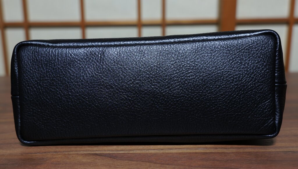 中の荷室は広くて長財布、携帯電話、600頁ある文庫本を一緒に入れても全く無理が無く、まだ少し余裕があります。クラッチバッグの方は長財布と携帯電話を入れると既にぱんぱんで、鞄が膨らんで見た目が悪かったので、ずっと気にしていました。下記画像の通り底面は平らで面積があるので、置くと自立します。この安定感が気に入っています。