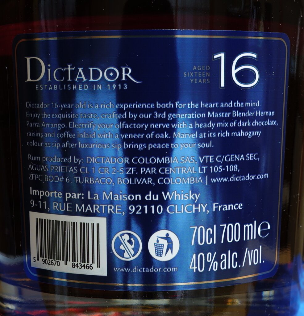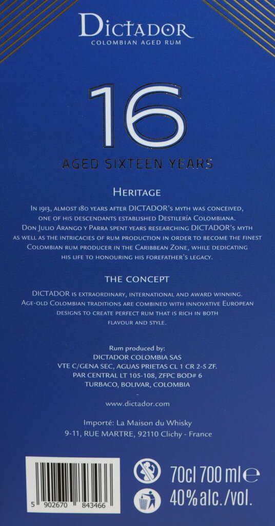 2025/12/11開封、価格は8,230円。度数40.0度、容量700ml。産地はコロンビア、ディクタドール蒸留所です。前に飲んだ10年物(別記事参照)と一緒に購入しましたが、他にも色々飲んでいたため、買ってから三か月後に開封しました。