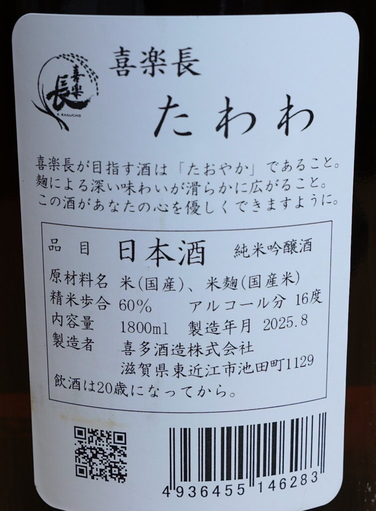 2025/10/30開封、価格は2,970円。度数16.0度、容量1,800ml(一升)。産地は日本、滋賀県は東近江市の喜多酒造株式会社。日本酒の記事第二弾です。