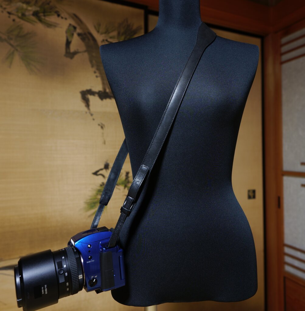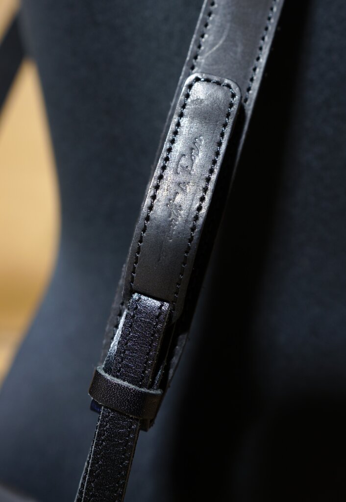 革は肉厚で如何にも耐久性がありそうです。艶のある革ですが、てかてかした感じではなく、落ち着いた雰囲気です。光の加減にも依りますが、色は真っ黒ではなく、墨黒の様な色合いです。やはり黒は飽きが来ず、どんな色にも合いますね。KFの青色とも良く合っています。他に本革を使った品のあるカメラストラップを知らないので、このブランドの価値は以前として高いかと思います。