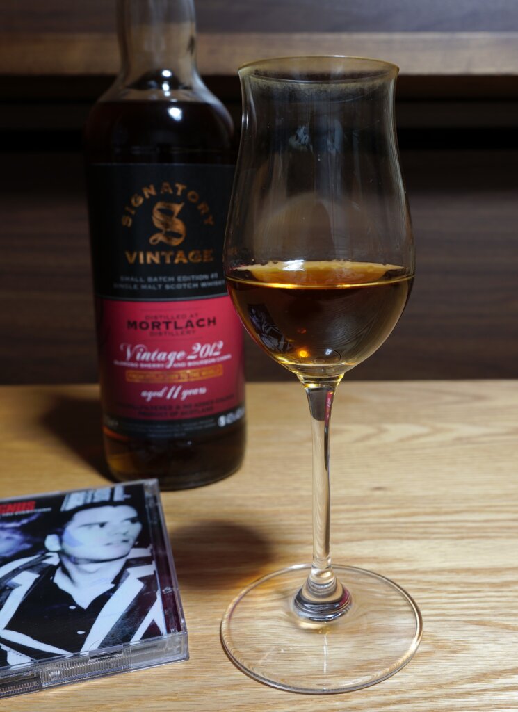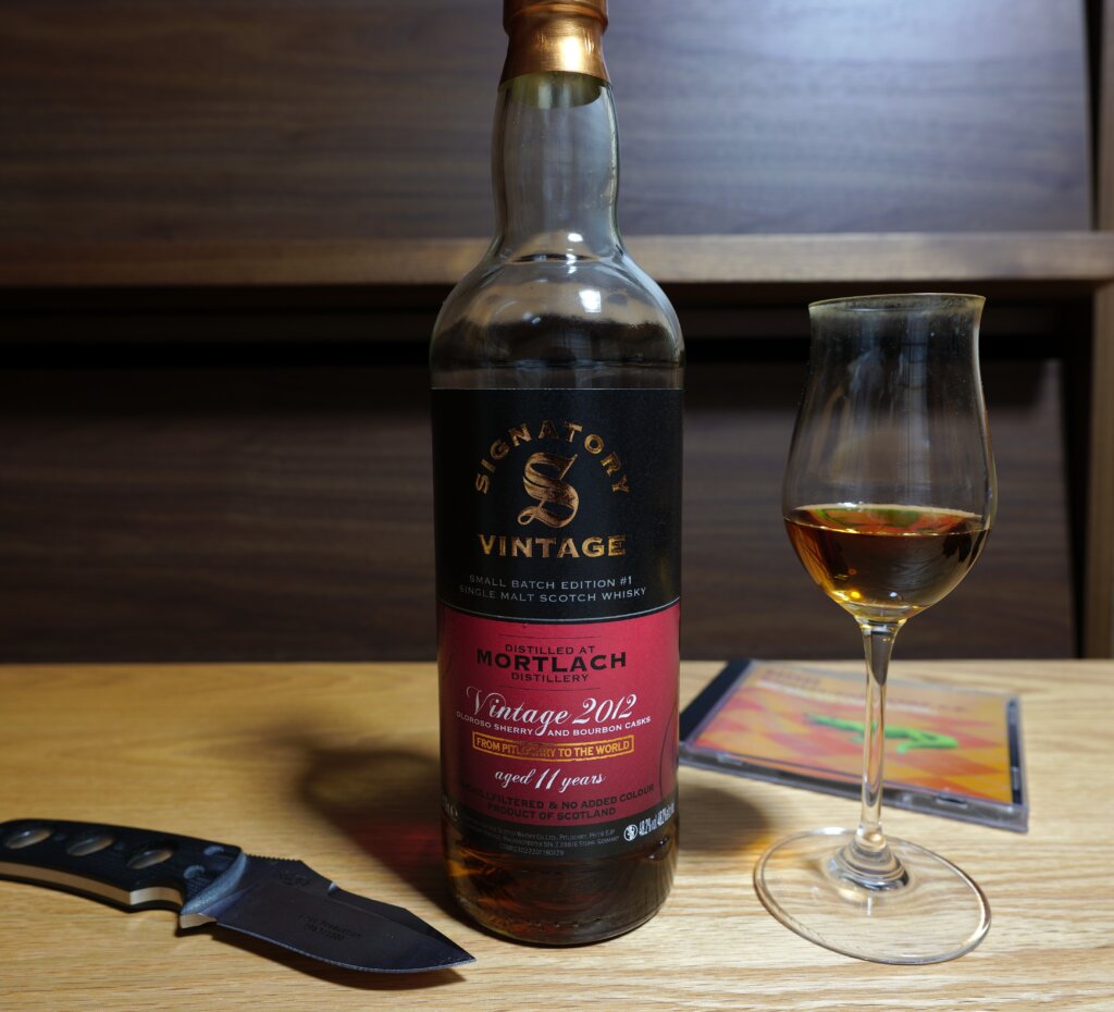 2025/12/6開封、価格は11,480円。度数48.2度、容量700ml。産地はスコットランド、スペイサイドモルトに分類されるモートラック蒸留所です。正確には瓶詰め業者のシグナトリーの商品です。前方のラベルに「UN-CHILLFILTERD」それから「NO ADDED COLOUR」の表示があります。表示の通り、冷却濾過・着色無しです。樽はバーボン樽とファーストフィルのオロロソシェリー樽(販売店にはファーストフィルの記載無し)を使っています。