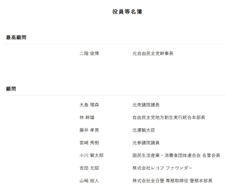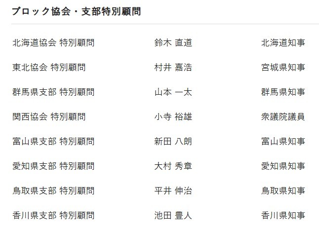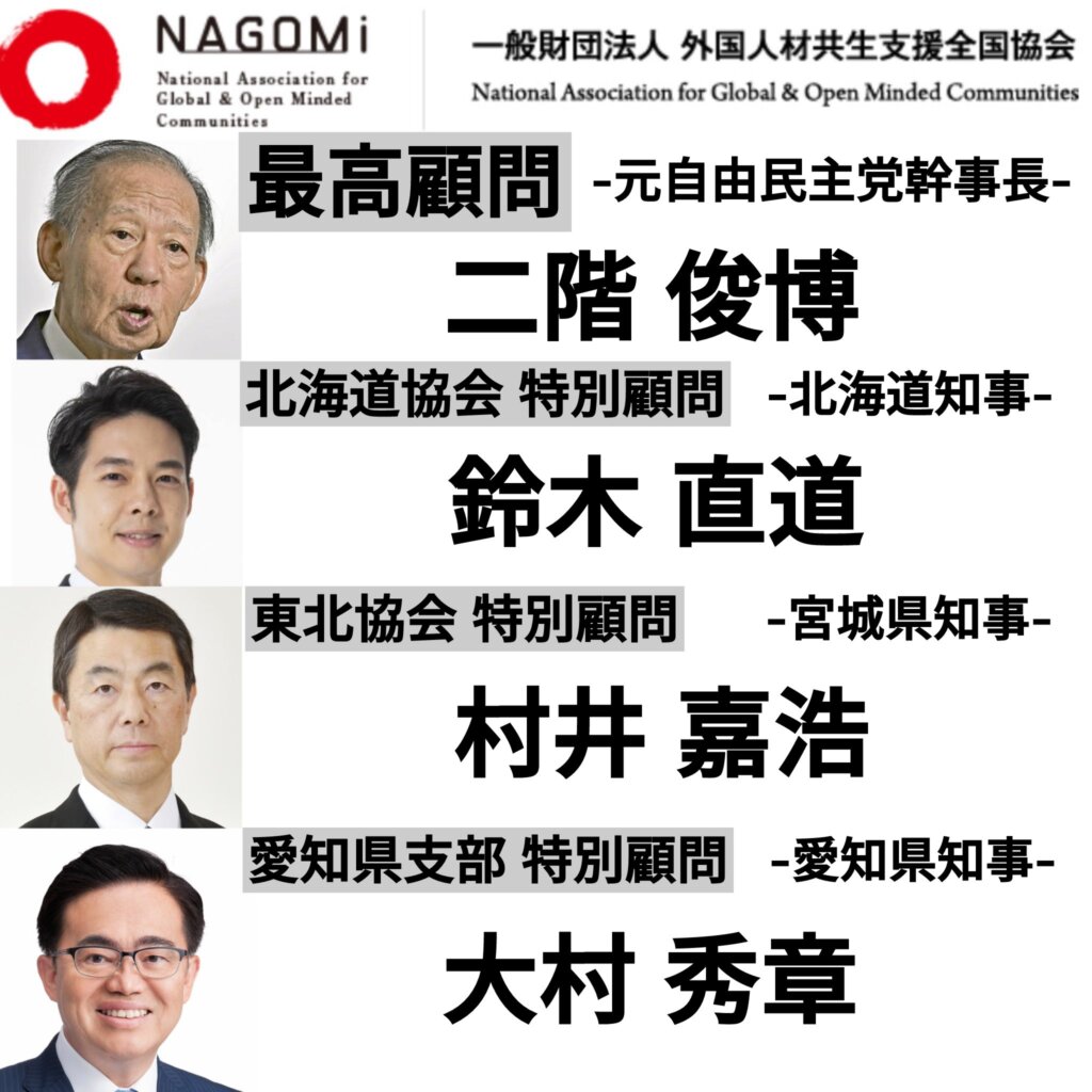 大村は一般財団法人・外国人材共生支援全国協会(NAGOMi)と言う組織に、「ブロック協会・支持特別顧問」として名を連ねています。X(旧ツイッター)の画像と、同法人の役員名簿を下記に掲載します。大村の他には二階が「最高顧問」として登録されている他(また二階!)、道県の知事や現職を含む国会議員の名もちらほら見えます。