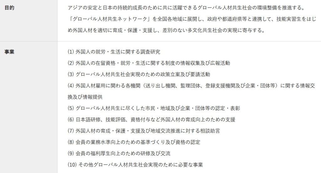 協会概要欄の目的・事業を見ると、早い話が「外国人に投資する」のが目的の事業だと分かります。悪名高い「技能実習生」の文字も確認出来ますが、そこに「外国人材を適切に育成・保護・支援し、差別のない多用文化共生社会の実現に寄与する」と書かれています。周知の通り、技能実習生は中抜きや非人道的扱いが国内外から非難されています。また、日本の経済は日本人の手によって支えるべきであり、外国人頼りにするのはもっての外です。外国人に投資し、海外にばら撒きする金があるなら、日本人に投資しなさい。さらに、多用文化とやらも要りません。真の多様性とはそれぞれの国がそれぞれの国の中で歴史・文化・自然と言ったものを連綿と守り続ける事にあり、移民を進めて多民族国家を形成したり、売国政策を推進する事ではありません。この様な連中が主張する多様な文化とやらは、確実に日本土着の固有の文化を破壊します。