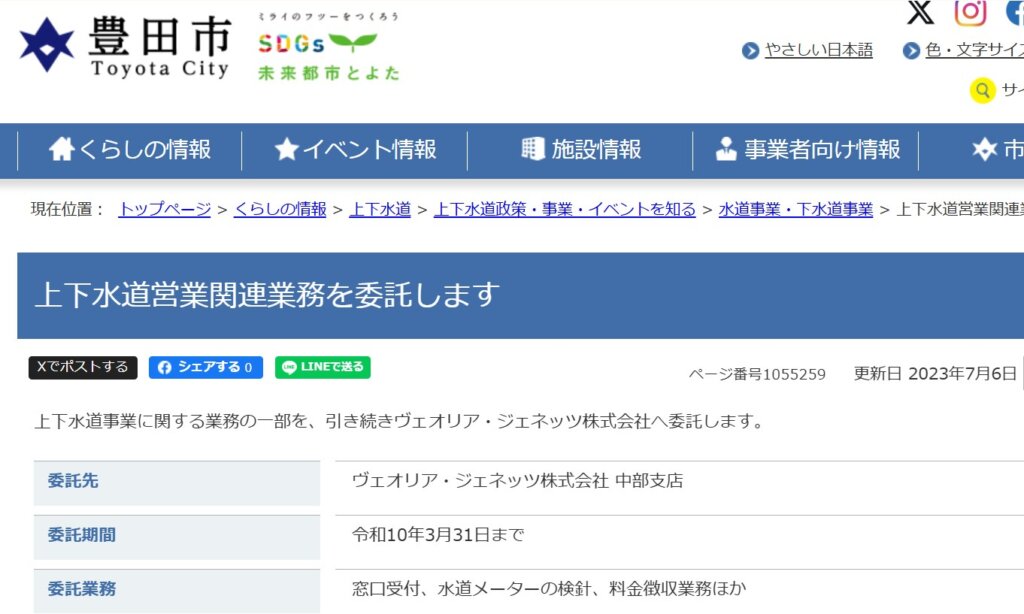 上記画像を見るとヴェオリア・ジェネッツ株式会社の文字が確認出来ます。ヴェオリアはフランスの水道関連企業で、その日本法人のヴェオリア・ジャパンの幹部と、自民党の麻生太郎の娘が結婚しています。周知の通り、麻生太郎は日本の水道民営化を推進する国賊の一人です。フランスは自分の国で水道民営化に失敗しているのに、人の土地で勝手な事をやるな!と憤りを覚えます。今のところ委託内容は事務や検針などのようですが、今後じわじわと浸食を進める気なのでしょう。国政どころか、市政の現場でも国の切り売りが進行しています。国民・市民を裏切った売国奴達は、これから覚悟した方がいいでしょう。