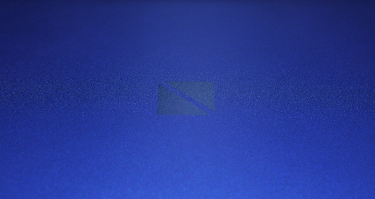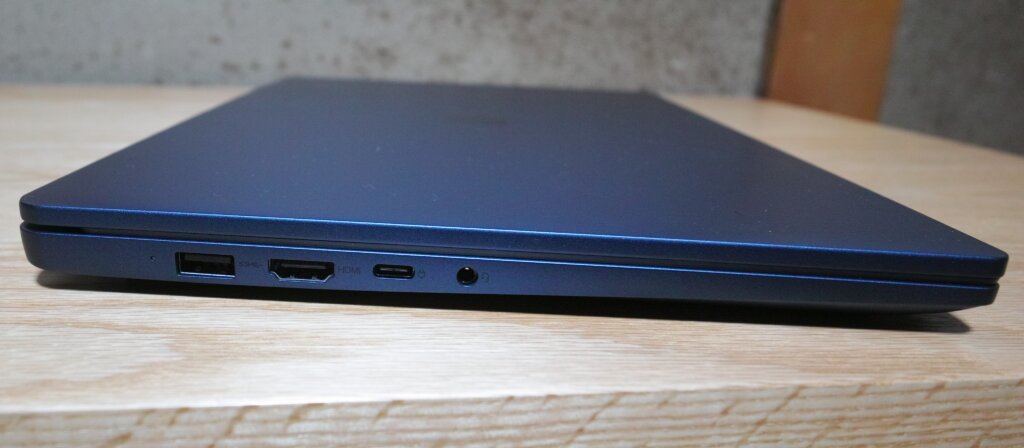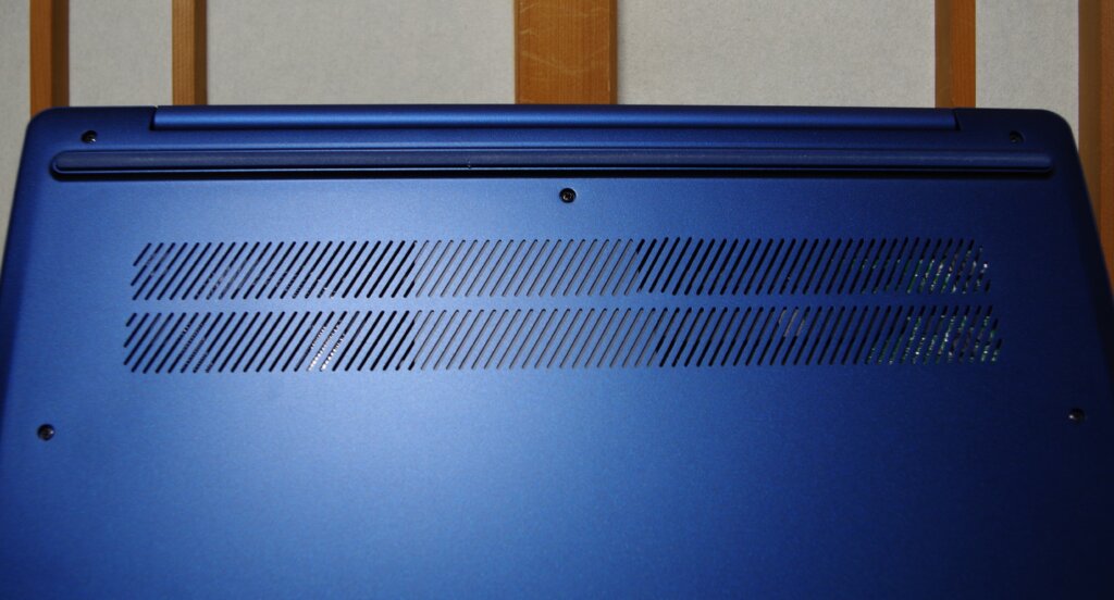 本体色は藍染のような色です。光沢を抑えてあり、表面を触ると僅かにざらざらしています。プラスチック剥き出しの、光を反射する本体より高級感があります。この独特の手触り、マグネシウムかと推測しましたが、後で調べたら当たっていました。ノートパソコンは本体に、軽量で頑丈なマグネシウムやアルミニウムを使う事があります。