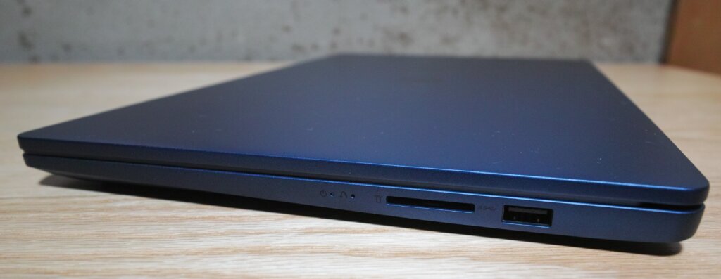左側面を見ると奥からUSB端子、HDMI端子、電源端子、イヤホン端子と配列されています。右側面を見ると奥からUSB端子、SDカード挿入口と配列されています。ディスクトレーが無いので、円盤でソフトをインストールする時は、外付けの機器が必要になります。また、LANケーブル接続端子も無いので、有線で通信したい人はこれも別途外付け機器が必要です。本当に必要最低限と言った印象の装備です。以前のノートパソコンはLANの切り替えスイッチや、音量の摘まみが付いていましたが、昨今は簡素化する傾向にあるようです。