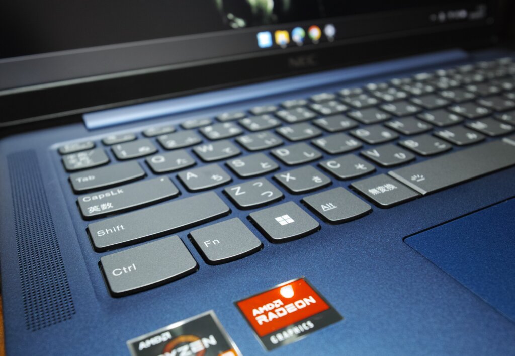 裏側を見ると放熱口が大きく開いているのが確認出来ます。キーボードの釦は薄く、四角ではなく独特の形状をしています。この釦は、手垢のような汚れが目立つ気がします。