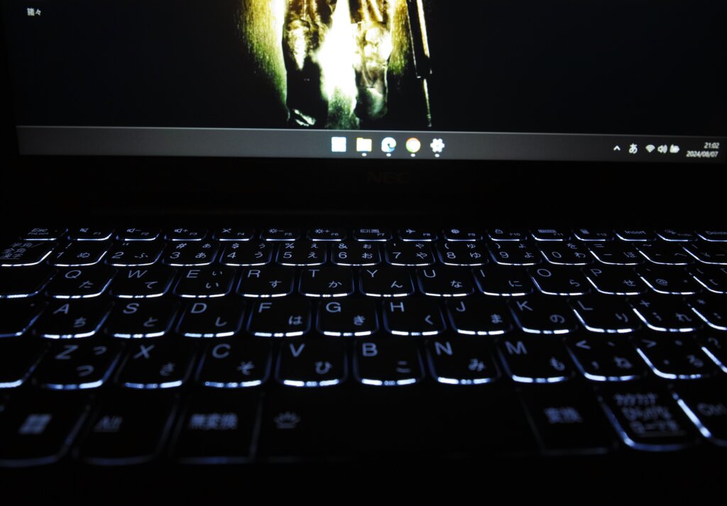キーボードのバックライト機能は個人的に大歓迎!全てのパソコンで標準装備にして欲しいぐらいです。Fnキーとスペースキーの同時押しで入り切り出来ます。私は根暗なので照明を落とした暗い部屋でパソコンを使うのが好きですが、そう言う時に非常に便利。あと、見た目が格好良い。過去のNECのノートパソコンにも同じ機能がありましたが、それは文字も光っていたような・・・このキーボードは釦が薄く、押した感じが硬くかっちりとして、操作が正確で良いです。以前の様な台形に大きく盛り上がって、ぶよぶよとした遊びの多かった釦とは雲泥の差です。釦を叩くとまるで将棋の駒を盤に置いた時の様な「ぱち・ぱち」とした音が鳴って、使っていて非常に気持ちが良い。やはり進化を感じずにはいられません。