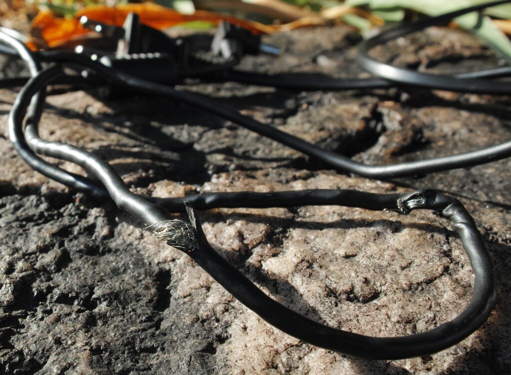 一代前は富士通のノートパソコン(型番忘れました)でした。これがあまりに酷かった。電源アダプターの配線に強い撚り癖が付いて、ついに被覆が破れて芯線が剝き出しになる程(下記画像参照)でした。何度も自分で撚りを戻しましたが、結局無駄でした。こんなに撚りが付く配線を他に見た事がありません。