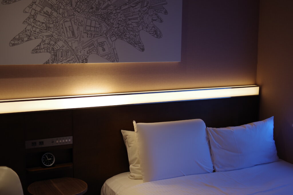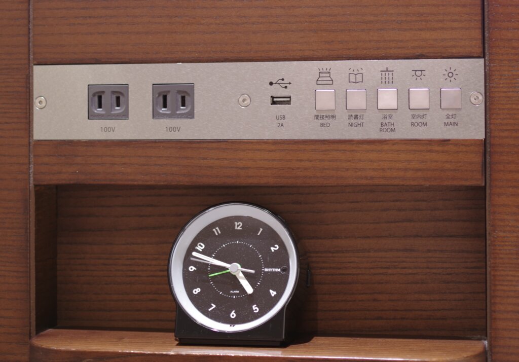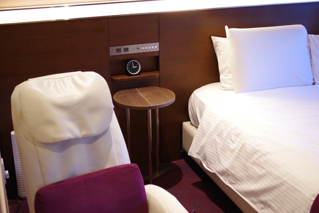 ベッドの枕元付近には置時計やコンセント等があります。側にマッサージチェア?みたいな物が置いてありますが、私は使わないので物置として利用しました。床に荷物を直置きしたくないので、荷物を置ける場所があると良かったと思います。