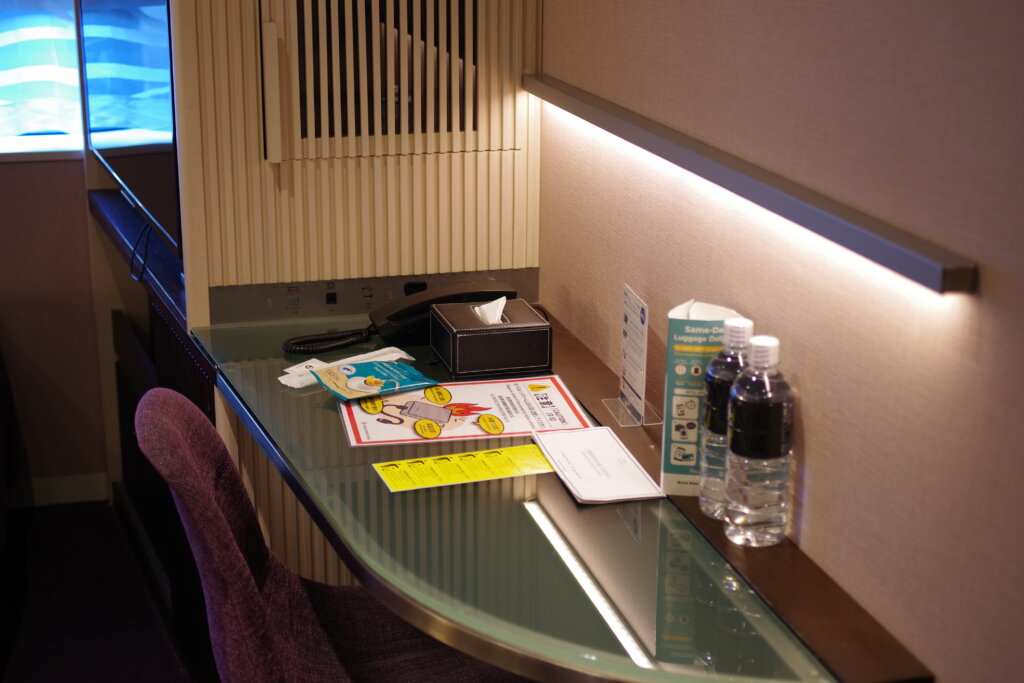 カードキーを受け取り部屋移動するついでに、机上の歯ブラシ等を貰いました。タオルやドライヤー等と違い、一部の消耗品は受付付近に置いてあります。ここに無料WiFiの情報も載っています。今時のホテルらしく、カードキーが無いと上階へ移動出来ない仕組みになっています。私はこのカードキーが嫌いで、普通の鍵でいいじゃんって思います。因みにこのホテルは、エレベーターで上へ行くにも下に行くにも、必ず受付がある四階で止まる仕組みになっています。どうやらこれは、行政指導の絡みがあるようです。不審者の侵入を防ぐ目的もあるかもしれませんが、そもそもカードキーが無いと宿泊客に便乗しないと上へ行けないですけれどね。これは自治体によって決まりが異なるようです。