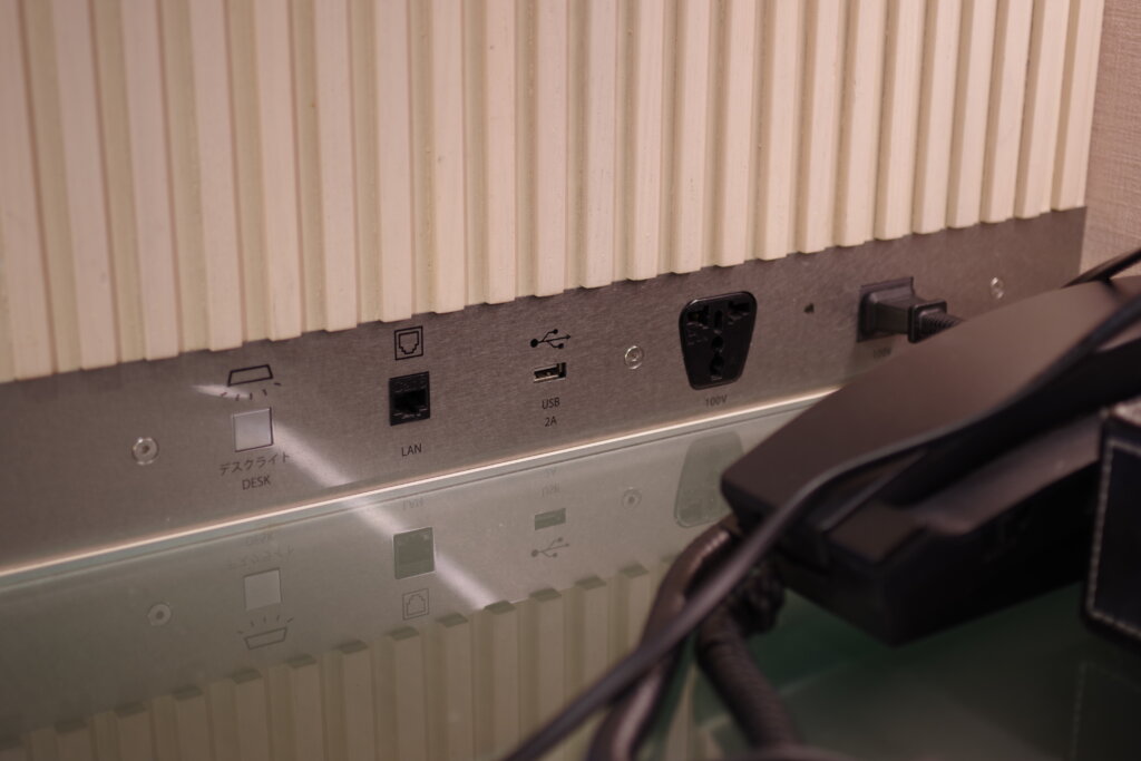 寝室の壁にある硝子天板の机は小さく、使い辛い。また、この机はパソコンのマウスの滑りが悪いです。ラミネートで綴じた注意書きがあったので、それを下敷きにしてマウスを使いました。ここにはコンセントやLANポート等があります。