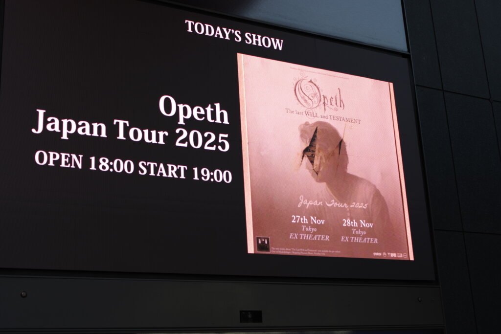 途中で出雲大社の建物を外から眺めたり、変哲もない建物を何となく撮影してみたり。会場はホテルから歩いて五分程度だと思います。地元と違い人の数が段違いなので、通行人との擦れ違いに気を遣いました。東京の人達は人の多さに慣れているのか、全然前から来る人を避けないですね。何か異常なものを感じました。EX THEATER ROPPNGIに付くと、本日のライブの電光掲示が目に付きました。「Opeth Japan Tour 2025」の文字を目にすると、いよいよここまで来たと言う実感と興奮が湧いて来ました。