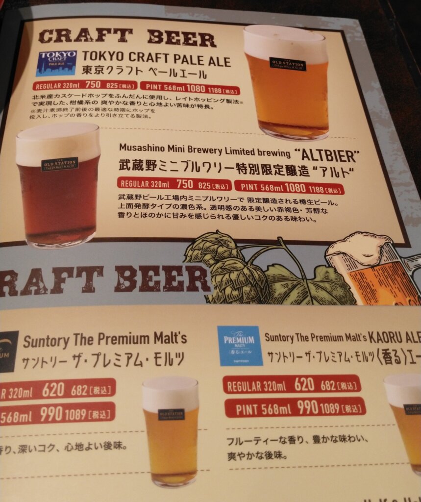 八重洲北口付近に飲食店が集合した一画がありますが、一階の店は平日でも順番待ちの列ができていました。私は酒が飲められれば食には余り頓着しませんので、待ち時間が少なく、すぐに入る事が出来る店を探しました。階段を上って二階に「北町酒場」と呼ばれる一画があるようだったので、酒場の二文字に誘われてふらふらと移動しました。一階と違い北町酒場はどの店も空いている様に見え、ここで落ち着く事に決めました。私が重視するのは料理よりも酒の品揃え。店の並びを二往復して、メニュー表や棚に並んでいる酒類を物色。候補を二店に絞って少し迷いましたが、オーヘントッシャンが目に付いたのでTHE OLD STATION Tokyo(以下オールド・ステーション)と言う店に決めました。