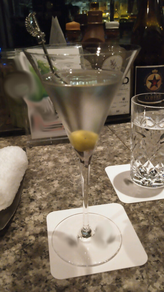 三杯目はカクテルの王様であるマティーニを注文。マティーニの作り方は最初にゴードンとタンカレーを、コニャックグラスみたいな容器に入れて混ぜていたと思います。そこから別の器に移して仕上げ。ヴェルモットはリレ・ブランを使っていました。マティーニも美味しかったですが、オリーブを避ける容器を用意して欲しかった。