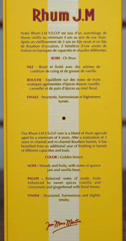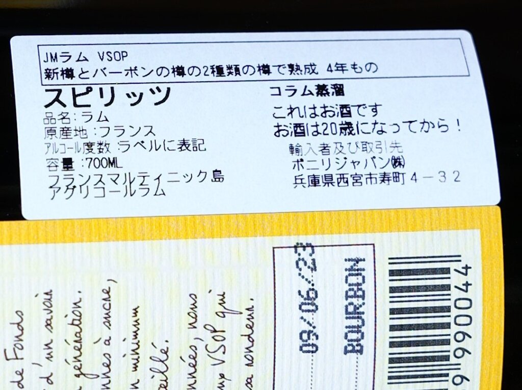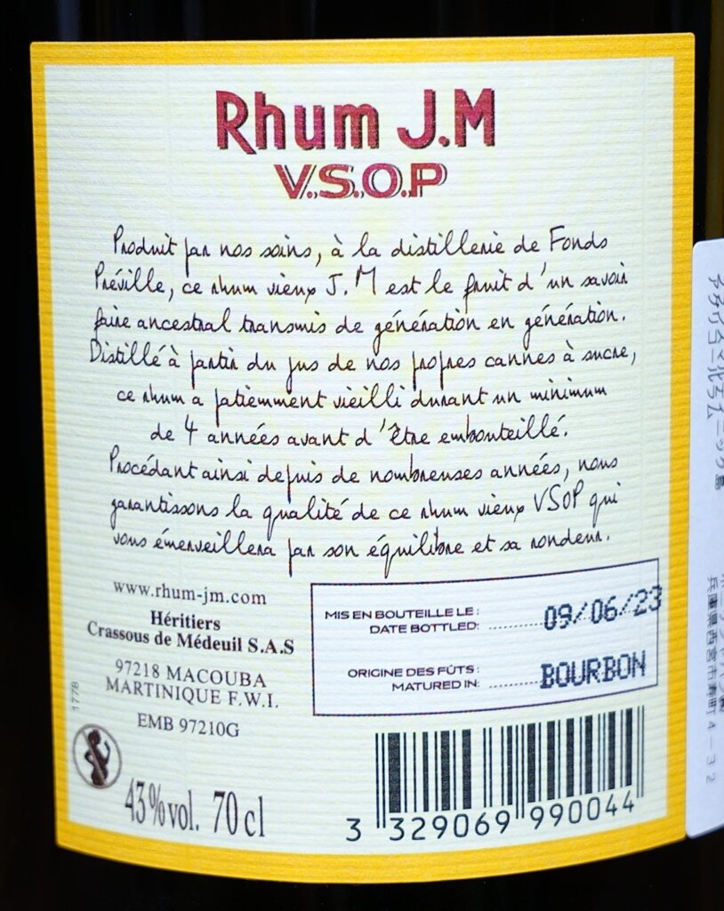 2025/9/24開封、価格は6,070円。度数43.0度、容量700ml。産地はカリブ海、フランス海外県マルティニークのフォン・プレヴィル蒸留所(ジーン・マリー・マーティン)です。コルクも供給不足な昨今ですが、ここのラムは低価格帯も含めてコルクを使っています。これまで飲んだラムJMの熟成年数は最大3年でしたが、この商品は4年。その味わいはいかに。