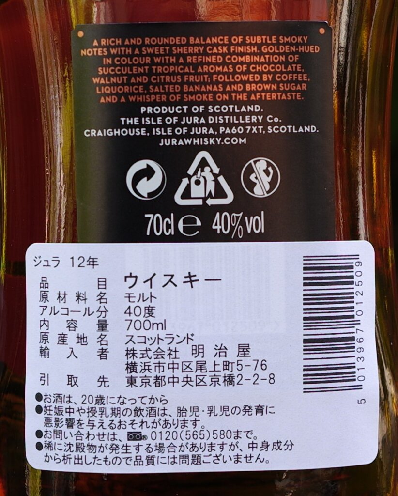 今年の夏にバーでジュラ10年の旧瓶を飲みましたが正直なところ、こちらの現行品の方が好み。基本的に、原酒が潤沢だった時代の商品の方が美味い傾向にあると思いますが、例外もあります。私は旧瓶を信仰の対象にはしていないので、現行品でも美味い物は正当に評価します。この商品は、はっとする様な分かり易い美味さではないと思います。本当に渋い味わいだと思うので好みが別れるだろうし、少し飲んだだけでそっぽ向かれてしまう可能性があるかも。人を選ぶかもしれませんが、ジュラはもっと評価されて言い銘柄だと思います。この12年物は、他の商品をもっと試してみたいと思わせてくれた良品だと評価します。ご馳走様でした。