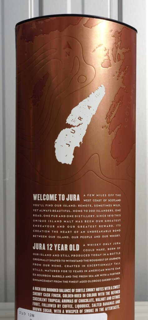 アイル・オブ・ジュラの商品を購入するのは実に四年ぶり。10年物もありますが、値段が殆ど変わらないので12年を購入しました。銅色の缶に入って来ますが塵の削減の為、余計な物を付けない方が良いと思います。万単位の高級品で立派な木箱が付いて来るなら別ですが、通常は捨てるだけなので。瓶は特徴あるバイオリンの様な、縊れた形状を持っています。